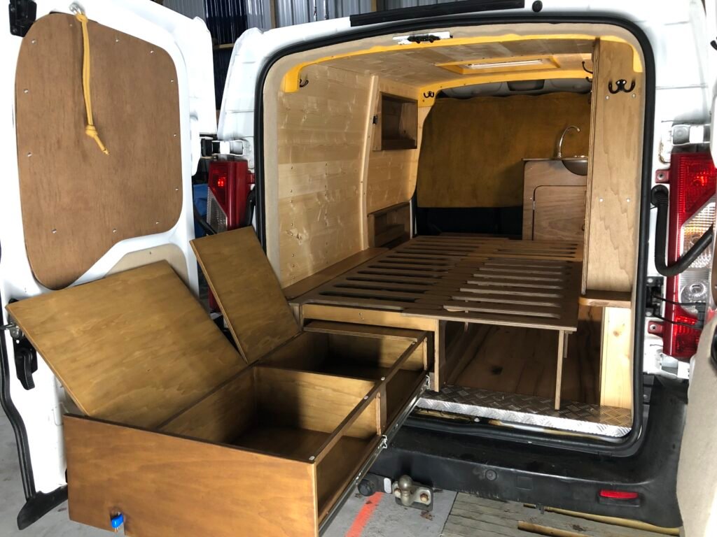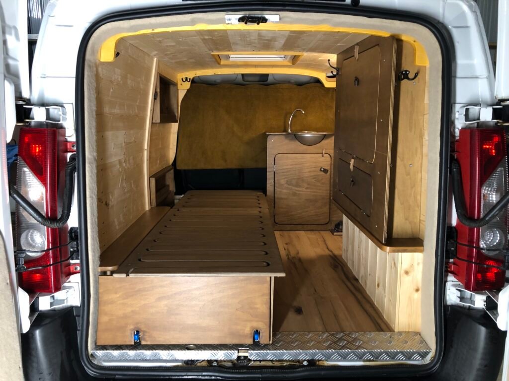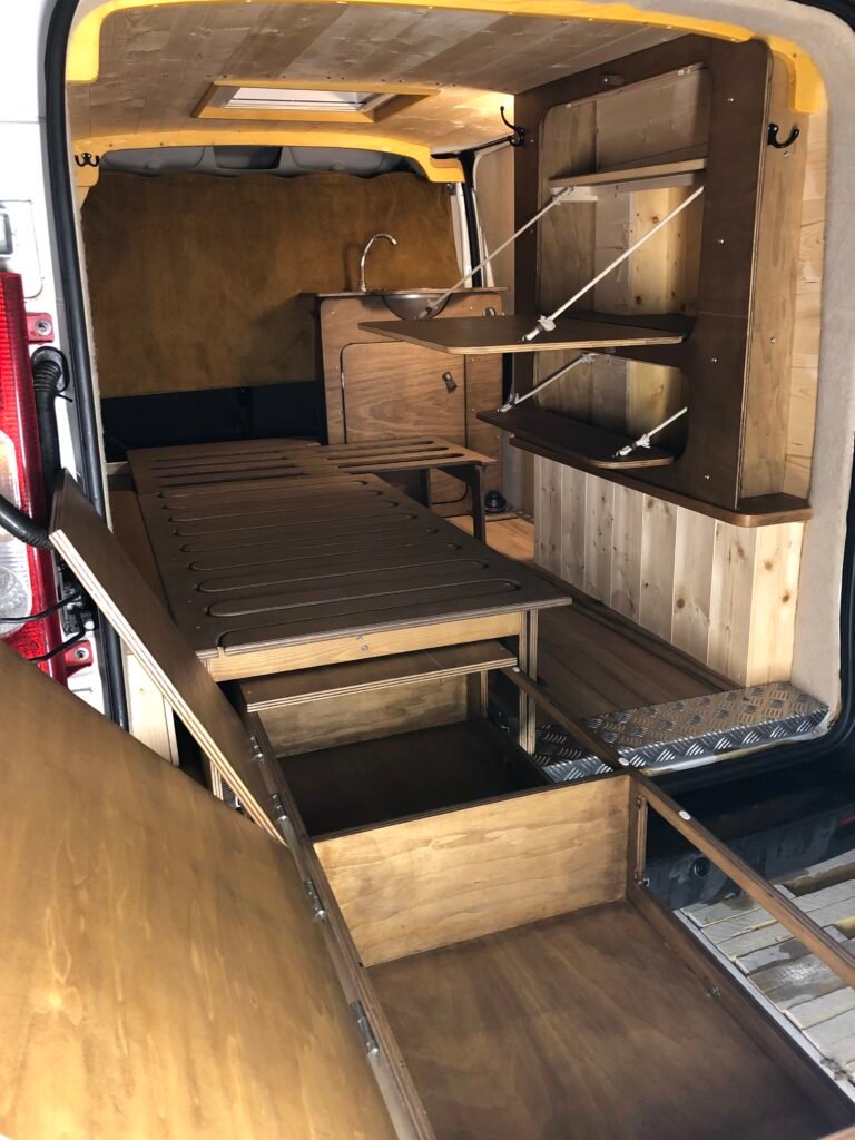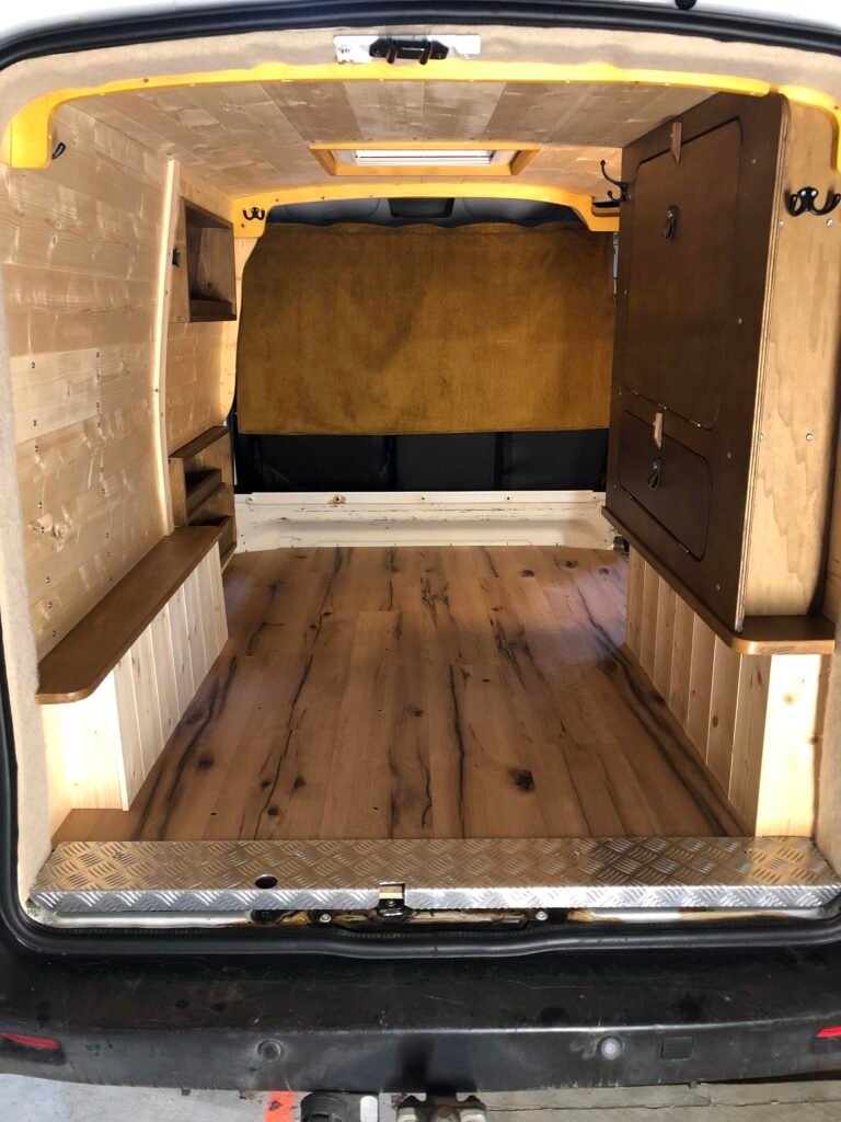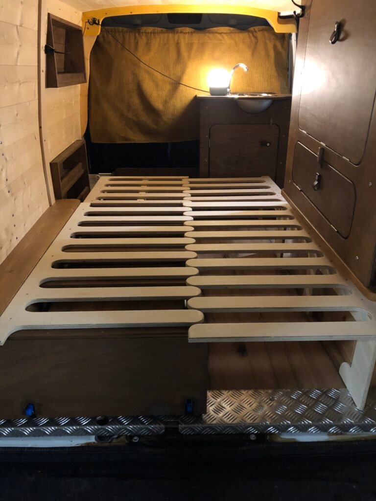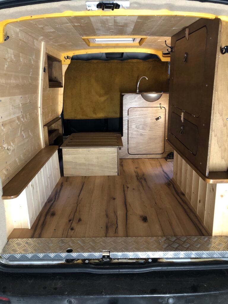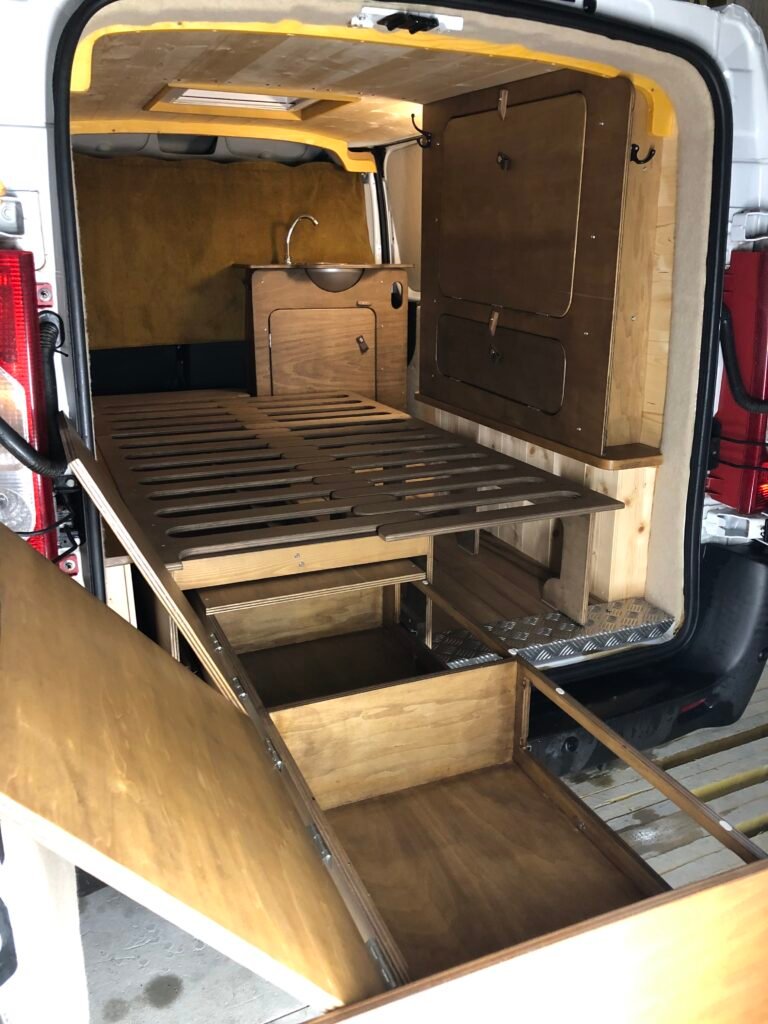 Ce « van » a changé de propriétaire. Marc et Séverine les acquéreurs m’ont demandé de modifier la banquette lit qui de base n’était prévue que pour une personne. Voici le résultat.